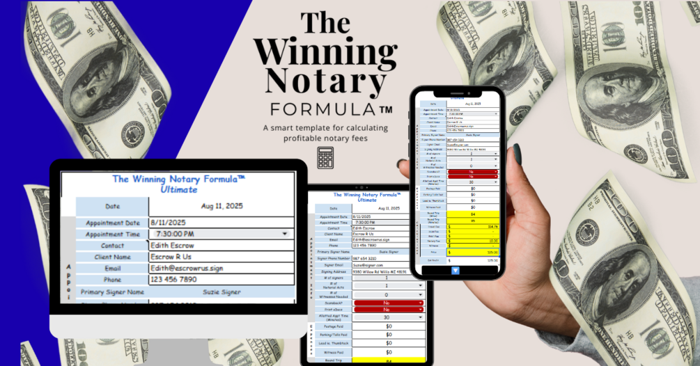 The Winning Notary Formula™ Ultimate helps you calculate fair, consistent pricing for your mobile notary services—no more guessing at what to charge.